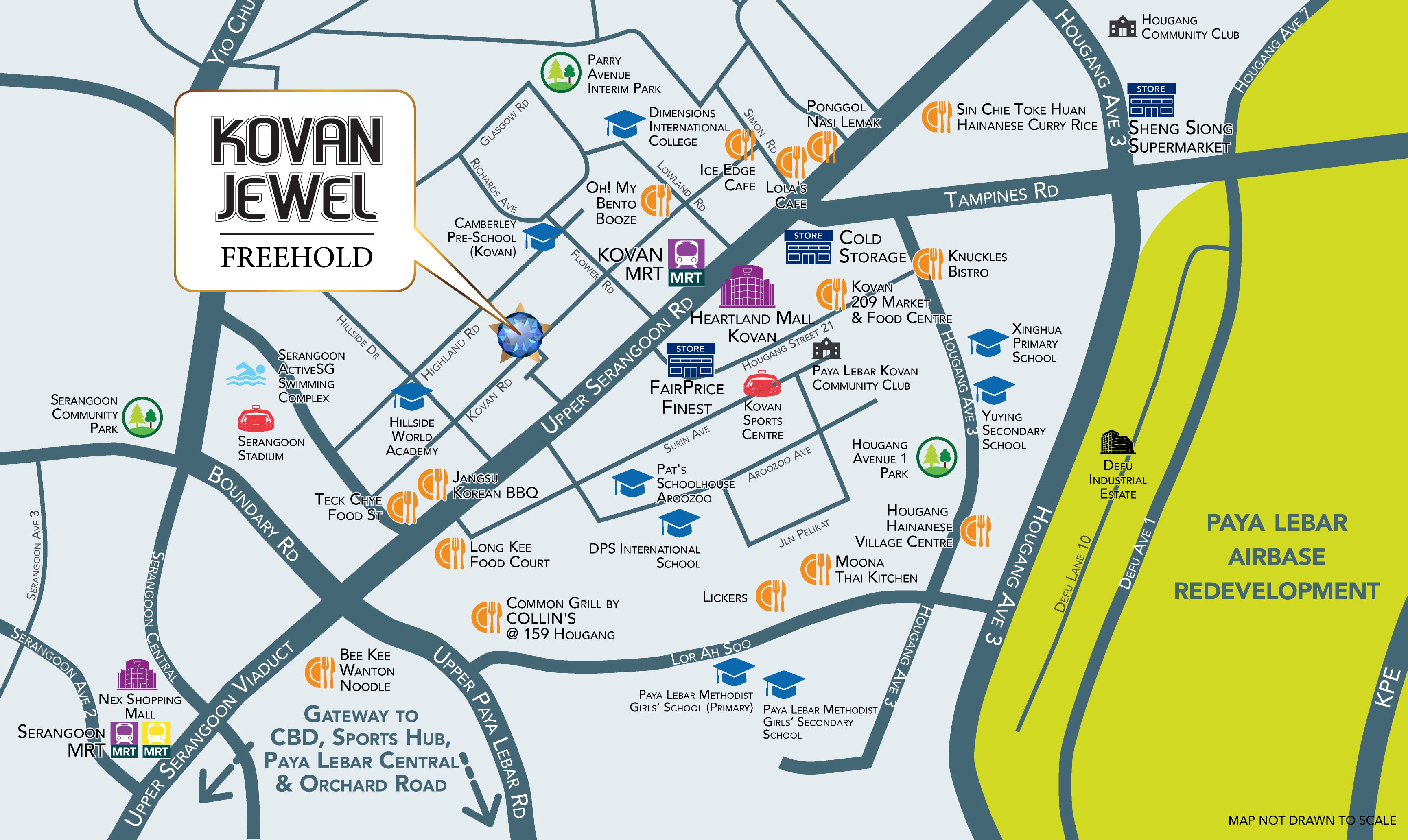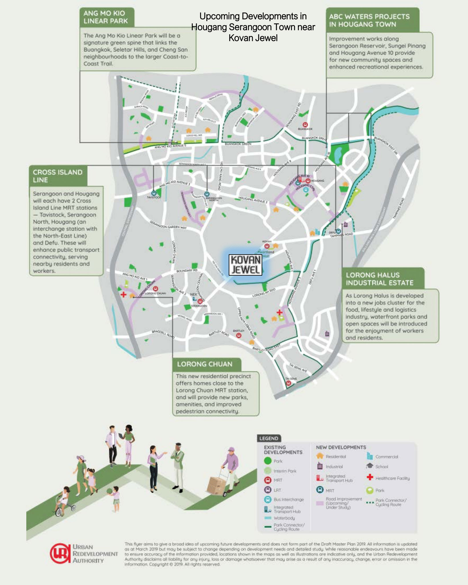 Kovan Jewel is located at Kovan Road in District 19. Kovan is a precinct within Hougang. Hougang and Serangoon towns are established towns that already boast a diversity of commercial amenities, residential types and employment opportunities. Both towns will be revitalised with new housing, community amenities and parks. The Cross Island Line (CRL) will shorten residents’ commute time even further.